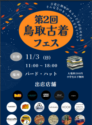 鳥取では古着を購入できる店舗が少なく、服に興味がある人が比較的少ないと感じています。そこで、県内だけでなく、県外の古着屋・一般の方などにも出店して頂き、鳥取の方に古着を中心とした衣類に興味を持ってもらうためのイベントを開催します♬