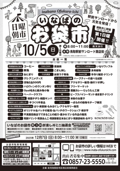 10月5日(日) 8:00~11:00 鳥取駅前サンロードにて 今年3回目の「いなばのお袋市」が開催されます! 約30店舗の出店がありますので朝市にぜひお越しください! また、今回も「第3回ミニお楽しみガラポン抽選会」もありますのでお立ち寄りの際はぜひ、お買い物をしてお得にガラポン抽選会をお楽しみください! ~抽選会参…