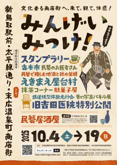 鳥取民藝発祥の地、鳥取駅前商店街・太平線通り商店街で毎年秋に開催している”民藝がテーマ”のイベントに、今年から末広温泉町商店街が加わり更にボリュームアップ!! 昨年大好評だった”ガラポン抽選会”を、装いも新たにスタンプラリーとの組み合わせで実施♬ 民藝の秋、文化香る商店街に来て・観て・体感してはいかがですか! 詳細は「…